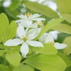 Le genre Choisya, dĂ©diĂ© au pasteur et botaniste genevois Jacques-Denis Choisy (1799-1859), comprend 7 espèces originaires du sud ouest des Etats Unis et du Mexique. Choisya ternata ou oranger du Mexique est l’espèce la plus cultivĂ©e. ‘ Sundance ‘ est une variĂ©tĂ© horticole rĂ©cente. Cet arbuste, au port arrondi, compact, atteint 2 m de hauteur pour une largeur de 2 m. Feuillage persistant, jaune dorĂ© au printemps et verdissant ensuite. Feuilles de 8 cm, Ă folioles ovales et pointues, odorantes. Floraison blanche, parfumĂ©e, en avril-mai, remontante en aoĂ»t-septembre. Fleurs dĂ©licates, de 3 cm de diamètre, en grappes terminales, ressemblant Ă la fleur d’oranger. Rustique, mais ne supportant pas un froid au delĂ de -10 °C. A rĂ©server Ă des rĂ©gions au climat doux ou Ă planter en situation chaude, ensoleillĂ©e, et Ă protĂ©ger du gel pendant l’hiver. Pousse dans un sol normal, lĂ©ger, mĂŞme lĂ©gèrement calcaire. Exposition au soleil. Supporte bien la taille pour la formation. On le plante en isolĂ©, en association dans des massifs ou haies libres basses. Convient très bien en bac.