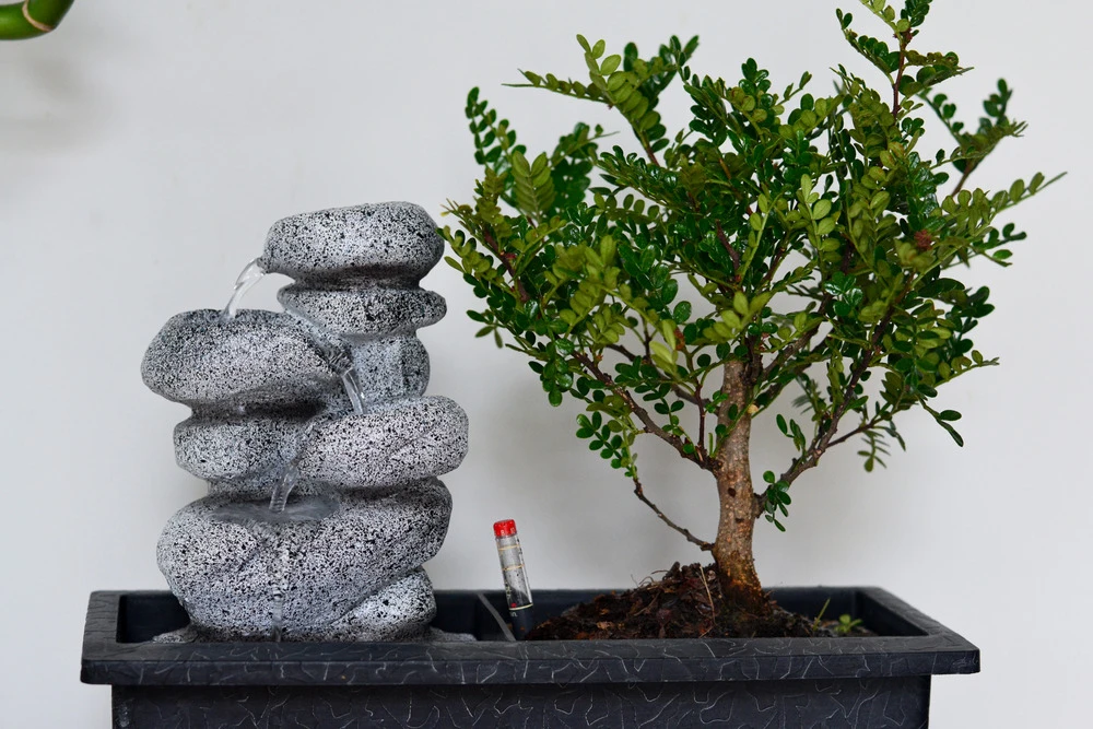 l’arrangement de bonsaĂŻ est livrĂ© avec une vĂ©ritable cascade qui coule. Le son de l’eau qui coule doucement vous aidera Ă vous calmer et Ă rester dĂ©tendu. La cascade est très facile Ă utiliser : remplissez le rĂ©cipient d’eau, branchez-le et l’eau commence Ă couler ! La petite pompe Ă eau ne fait pratiquement aucun bruit, de sorte que ce magnifique arrangement oriental peut ĂŞtre utilisĂ© non seulement Ă la maison, mais aussi au bureau. La composition bonsaĂŻ peut Ă©galement ĂŞtre placĂ©e sur votre bureau, pour vous garder « zen » toute la journĂ©e.